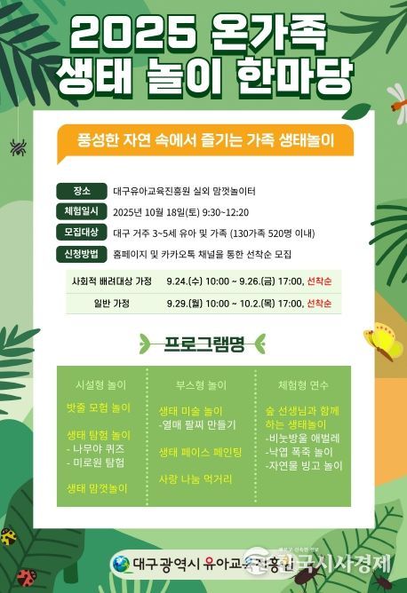한국시사경제 대구취재본부 | 대구유아교육진흥원은 오는 10월 18일 대구에 거주하는 유아와 동반가족 130가족을 대상으로 생태 체험 프로그램‘2025 온가족 생태놀이 한마당’을 운영한다.