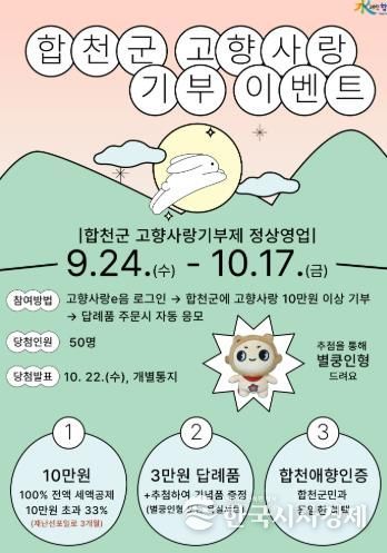 한국시사경제 윤경수 기자 | 합천군은 민족 최대 명절인 추석을 맞아 고향사랑기부제 참여 분위기를 확산하고, 건전한 기부 문화 정착을 위해 '추석맞이 고향사랑기부제 기념품 증정 이벤트'‘합천군 고향사랑기부제 정상영업 합니다’를 추진한다.