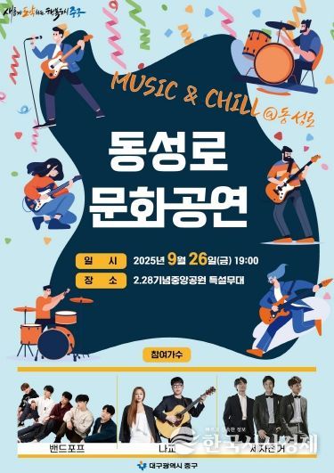 이번 공연은 도심 대표 관광명소인 동성로에서 시민과 관광객이 함께 어울리며 음악과 여유를 즐길 수 있도록 마련됐다. 젊음과 활력, 감성을 담은 무대를 통해 동성로만의 문화적 매력을 전할 예정이다.