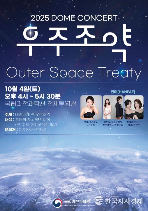 한국시사경제 김숙영 기자 | 과학기술정보통신부 국립과천과학관은 세계 우주 주간을 맞아 오는 10월 4일 오후 4시, 천체투영관에서 돔 토크 콘서트 '대중매체 속 우주 조약'을 개최한다고 밝혔다.