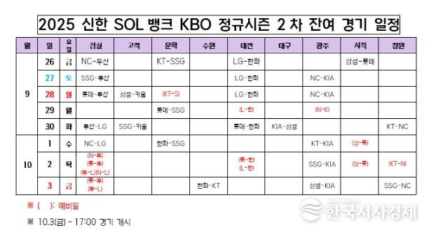한국시사경제 스포츠팀 | KBO는 26일(금) 2025 신한 SOL뱅크 KBO 정규시즌 2차 잔여 경기 일정을 확정했다.