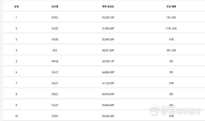 2위 김상현과 10위 김태우(27.(주)하이니스임플란트)의 포인트 격차는 22,659.96포인트다. 또한 10위 김태우와 13위 이승형(22), 17위 김범수(27)와 포인트 차는 각각 10,221.45포인트, 12,766.24포인트다. 10위 김태우와 20위 하충훈(35.㈜일신테크놀로지)와 차이는 16,500.06포인트다.