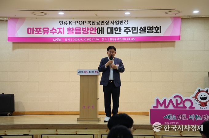 한국시사경제 한장선 객원기자 | 서울시 마포구는 9월 30일 오후 용강동주민센터에서 마포유수지 한류 케이팝(K-POP) 복합공연장 조성사업 변경과 관련하여 주민설명회를 개최하고, 공연장 대신 주민 생활밀착형 체육문화복합시설을 새롭게 추진하겠다고 밝혔다.