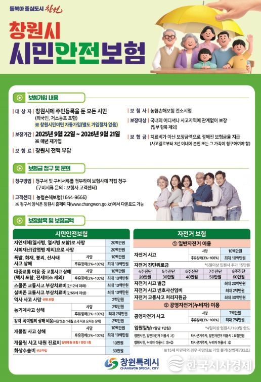 한국시사경제 윤경수 기자 | 창원특례시는 시민들이 더 많은 보험혜택을 받을 수 있도록 2025년 창원시 시민안전보험을 9월 22일부터 개정하여 운영한다고 1일 밝혔다.
