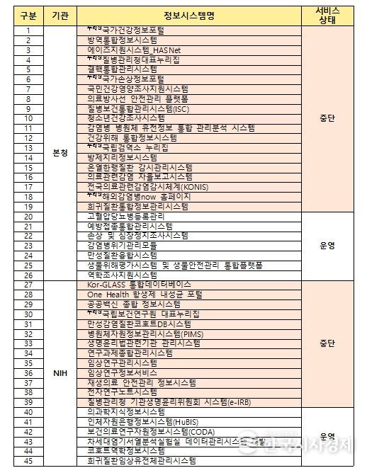 질병관리청은 총 45개의 정보시스템을 운영 중이며, 이 중 국가정보자원관리원에 입주한 방역통합정보시스템, 질병보건통합관리시스템, 질병관리청 대표누리집 등 32개 정보시스템이 중단된 상태라고 알렸다.