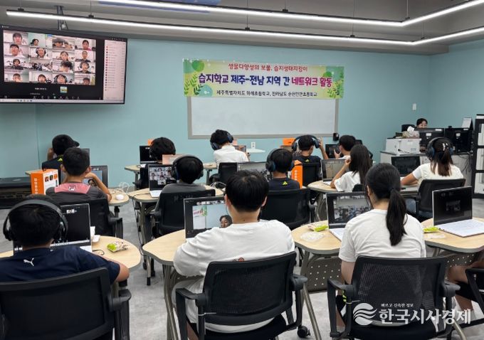 한국시사경제 한장선 객원기자 | 제주도교육청 하례초등학교는 9월 30일 전남 순천인안초등학교와 함께 비대면 화상회의 플랫폼(ZOOM)을 활용해 생태관광을 주제로 공동수업을 진행했다.