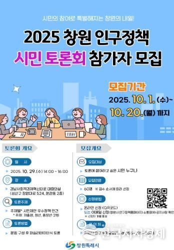 한국시사경제 윤경수 기자 | 창원특례시는 ‘시민이 제안한 인구정책을 시민이 직접 사업화 및 고도화 시킨다’는 취지로 오는 10월 29일 ‘2025 창원 인구정책 시민토론회’를 개최하고 이를 위해 10월 1일부터 20일까지 시민 토론참가자를 모집한다고 밝혔다.