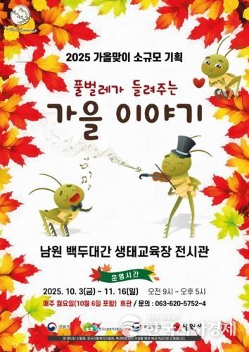 한국시사경제 윤경수 기자 | 남원시는 2025년 가을을 맞아 오는 10월 3일부터 11월 16일까지 백두대간 생태교육장과 지리산 허브밸리를 연계하여 각각 가을을 대표하는 풀벌레 등 다양한 곤충 전시하는 『풀벌레가 들려주는 가을이야기』, 그리고 다가오는 할로윈을 맞아 절지동물을 주제로 한 『미리 만나는 할로윈 : 오싹오싹 절지동물』 기획전을 진행한다.