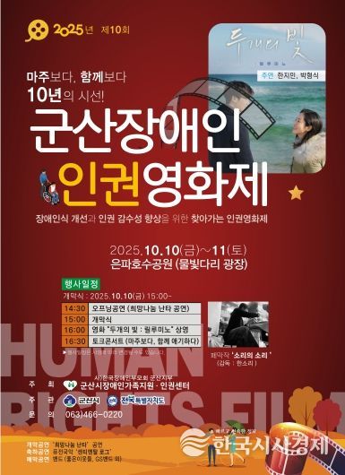 한국시사경제 윤경수 기자 | 군산시 장애인가족지원인권센터가 10월 10일부터 11일까지 은파호수공원 물빛다리 광장에서 군산시민을 대상으로 장애인 인식개선 및 인권의식 함양을 위한 2025년 제10회 군산장애인인권영화제를 개최한다.