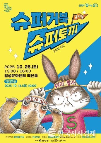 한국시사경제 대구취재본부 | 달성문화재단은 오는 25일 오후 1시와 4시, 달성문화센터 백년홀에서 ‘2025 달성 아동극 시리즈’의 다섯 번째 공연 ‘슈퍼거북 슈퍼토끼’를 개최한다고 밝혔다.