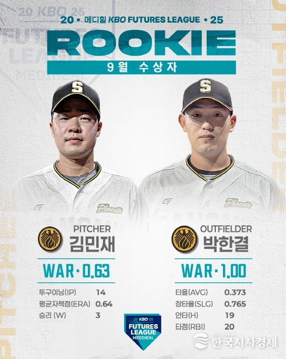 한국시사경제 스포츠팀 | 2025 메디힐 KBO 퓨처스리그의 9월 퓨처스 루키상 수상자로 투수 부문에는 상무 김민재가 WAR 0.63, 타자 부문에는 상무 박한결이 WAR 1.00을 기록하며 각각 선정됐다.