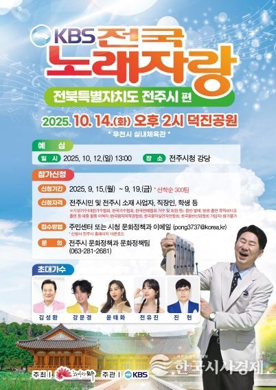 전주시 관계자는 “전국노래자랑은 대한민국을 대표하는 국민 참여형 프로그램으로, 시민 누구나 주인공이 될 수 있는 무대”라며 “가을 정취가 물씬 풍기는 덕진공원에서 열리는 이번 녹화에 많은 시민들이 함께해 주시길 바란다”고 말했다.