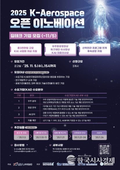 이번'2025 K-Aerospace 오픈 이노베이션'은 10월 13일부터 11월 5일까지 공모를 진행하며, 모집 대상은 수요기업인 KAI에서 제시한 총 4개 분야에서 KAI와 협업을 희망하는 기업으로, 서류 및 발표평가를 거쳐 총 3개사를 선정할 예정이다. 최종 선정기업에는 우주항공청장상, 특구재단 이사장상, KAI 대표이사상이 수여되며, 총 3천만원 규모의 KAI 사업화 자금이 지원된다.