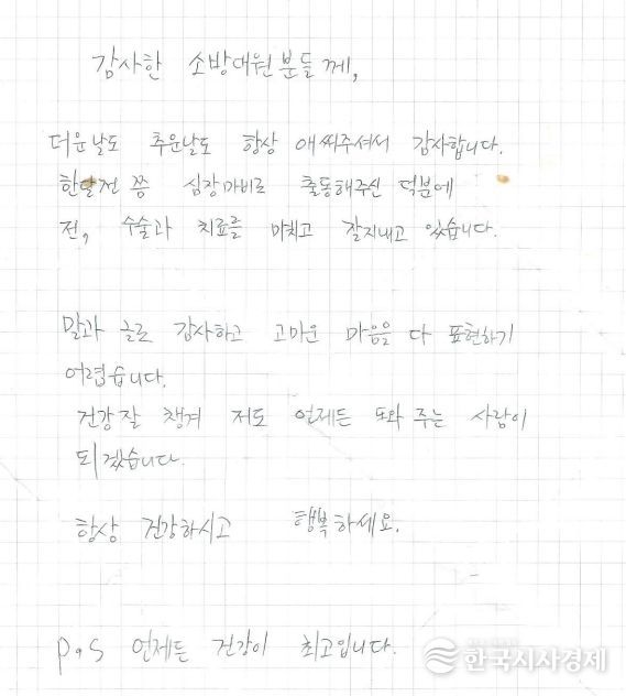 김원형 구급대원은 “당연히 해야 할 일을 했을 뿐인데 이렇게 감사 인사를 받아 오히려 부끄럽다”며 “A씨가 건강을 회복하고 퇴원하셨다는 소식을 들으니 뿌듯하다”고 말했다.