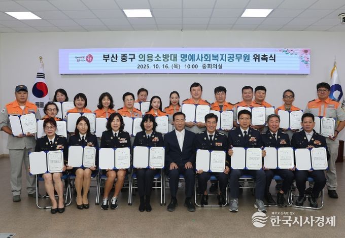 한국시사경제 오영주 기자 | 부산 중구는 지난 16일 중부소방서 의용소방대원 54명을 중구 명예사회복지공무원으로 위촉하는 행사를 개최했고, 중부소방서 의용소방대 본대 이봉석 남성대장, 심경란 여성대장등이 참석했다.