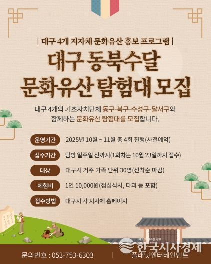 한국시사경제 대구취재본부 | 대구 북구청은 지난 2월 대구 4개 기초자치단체(북구, 달서구, 동구, 수성구)가 체결한 ‘대구 문화유산 공동연구 및 활용·보호’업무 협약의 일환으로 「대구 문화유산 탐험대」를 운영한다.