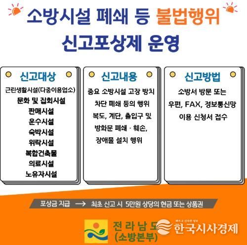 한국시사경제 오영주 기자 | 나주소방서는 소방시설에 대한 불법행위를 근절하고 자율적인 안전문화를 정착시키기 위해 연중 ‘불법행위 신고포상제’를 운영하고 있다고 21일 밝혔다.