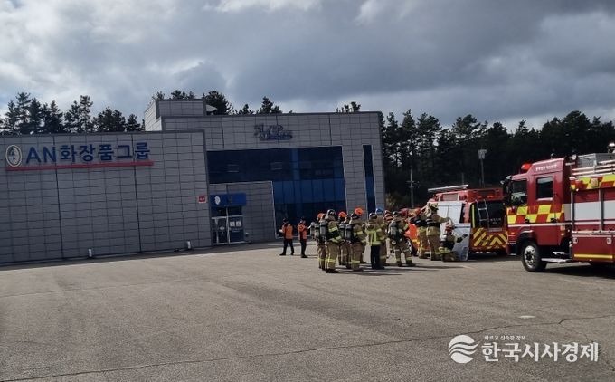 한국시사경제 오영주 기자 | 영동소방서장는 24일 황간면에 위치한 AN화장품 공장에서 가상 화재상황 부여에 따른 충북형 화재진압 현장지휘 전술 훈련을 실시했다.