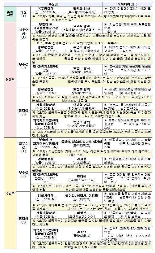 경찰부 최우수상은 ‘인공지능 기반 첨단혈흔형태분석 솔루션’을 제안한 치안정책연구소 김한별 경감, 국민부 최우수상은 ‘인공지능 기반 치매노인 위험 예측‧대응시스템’을 제안한 홍익대학교 윤진규 등 4명이 수상했다.