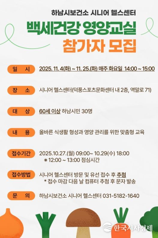한국시사경제 의료보건팀 | 하남시는 10월 27일부터 29일까지 지역 내 60세 이상 시민을 대상으로 건강한 식습관 형성과 만성질환 예방을 돕기 위한 ‘백세건강 영양교실’ 참가자를 모집한다.