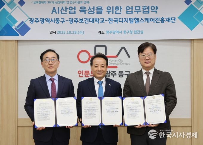 한국시사경제 의료보건팀 | 광주 동구는 지난 29일 구청 접견실에서 광주보건대학교(총장 김경태), 한국디지털헬스케어진흥재단(원장 박기원)과 인공지능(AI) 헬스케어 산업 육성, 인구 감소 해결, 원도심 활성화를 위한 업무협약을 체결했다고 밝혔다.