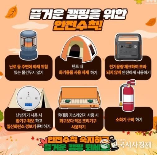 한국시사경제 오영주 기자 | 서산소방서는 본격적인 가을철 캠핑 시즌을 맞아 캠핑장에서 발생할 수 있는 화재와 일산화탄소 중독 등 안전사고를 예방하기 위해 안전수칙 준수를 적극적으로 당부했다.