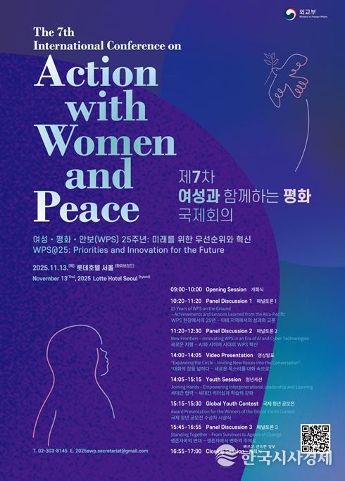 한국시사경제 해외팀 | 외교부는 11월 13일 롯데호텔 서울에서 제7차 '여성과 함께하는 평화' 국제회의를 개최한다. 이번 국제회의는 유엔 여성ㆍ평화ㆍ안보(Women, Peace and Security, WPS) 의제 논의 25주년을 맞아 WPS 의제의 “미래를 위한 우선순위와 혁신”이라는 주제로 개최된다.