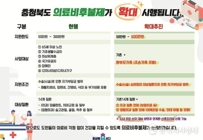 김영환 충청북도지사는 “앞으로도 제도의 효과성과 지속가능성을 면밀히 검토해 지원 범위를 전 질환으로 확대하고 도민 누구나 의료비 걱정 없이 건강을 지킬 수 있도록 세심히 살피겠다”고 밝혔다.