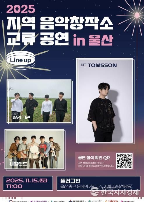한국시사경제 울산취재본부 | 울산 중구문화의전당에서 운영하는 울산음악창작소가 오는 11월 15일, 11월 16일 오후 5시 성남동 플러그인(문화의거리 14)에서 ‘2025 지역 음악창작소 교류 공연 in 울산’을 개최한다.