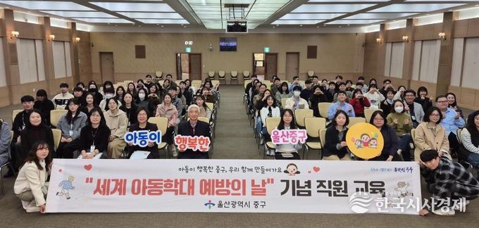 한국시사경제 울산취재본부 | 울산 중구가 제19회 세계 아동학대 예방의 날을 맞아 11월 13일 오전 10시 중구청 대회의실에서 직원 200여 명을 대상으로 아동학대 예방 직원 교육을 진행했다.