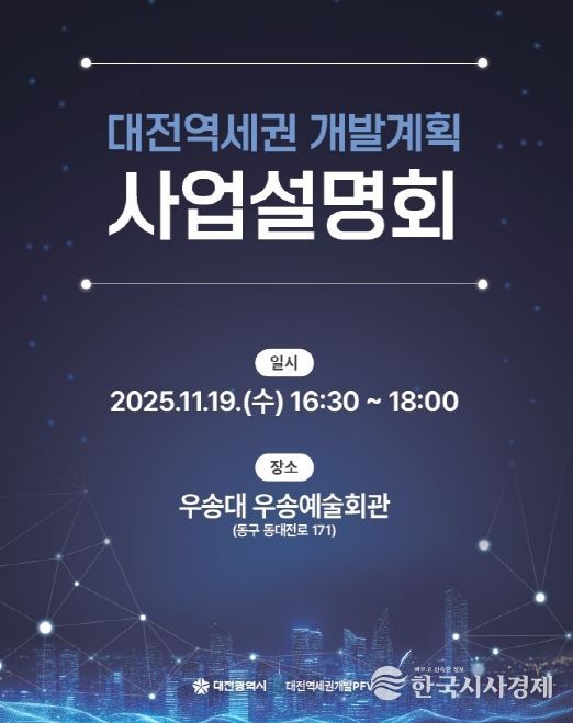 이번 사업설명회는 본격적인 사업 추진을 앞두고 사업 추진 현황과 계획을 공유하는 자리로, 대전시와 ㈜대전역세권개발PFV가 공동으로 주최하고 이장우 대전시장, ㈜대전역세권개발PFV, 지역의원, 한국철도공사 등 관계기관, 지역 건설업계, 상인연합회, 주민 등 다수가 참석할 예정이다.