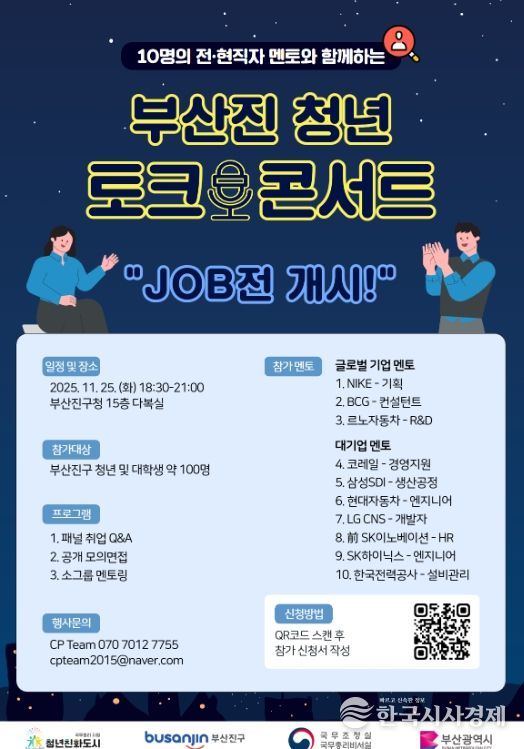 한국시사경제 부산취재본부 | 부산진구는 오는 11월 25일, 청년들의 실전 취업역량 강화를 위해 ‘2025년 부산진청년토크콘서트-JOB전 개시!’를 개최한다고 밝혔다.