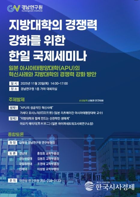 한국시사경제 해외팀 | 경남연구원(원장 오동호)은 20일 경남연구원 1층 가야대회의실에서 ‘일본 아시아태평양대학(APU)의 혁신사례와 지방대학의 경쟁력 강화 방안’을 주제로 ‘지방대학의 경쟁력 강화를 위한 한‧일 국제세미나’를 개최했다.