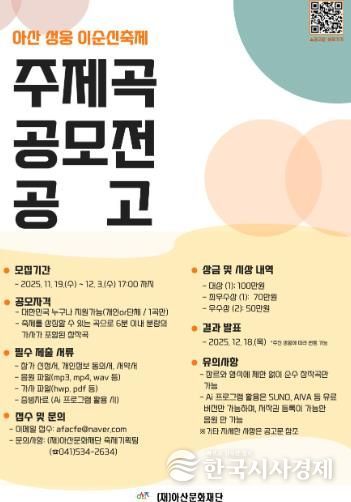 한국시사경제 충남취재본부 | (재)아산문화재단은 '아산 성웅 이순신축제'의 주제곡 공모전을 개최한다고 밝혔다.