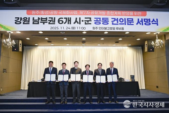 한국시사경제 경제팀 | 강원 남부권 6개 시군(원주·횡성·영월·평창·정선·태백)은 24일 오전 11시, 호텔인터불고 원주에서 국토교통부의 ‘제7차 공항개발 종합계획’에 ‘원주(횡성)공항의 국제화 사업 반영’을 요청하는 공동 건의문을 채택했다.