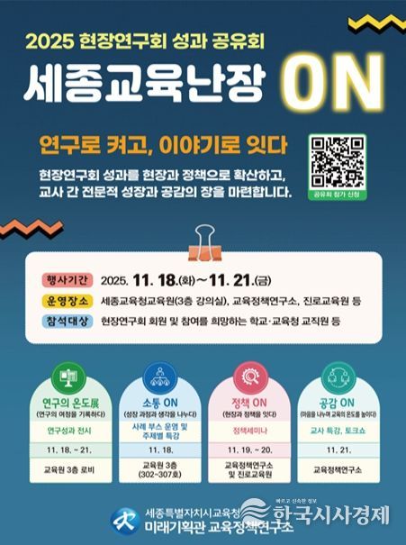 한국시사경제 세종취재분부 | 세종특별자치시교육청은 11월 18일부터 21일까지 4일간 2025년 현장연구회 운영 성과 공유 주간 ‘세종교육 난장-ON’을 운영했다고 밝혔다.