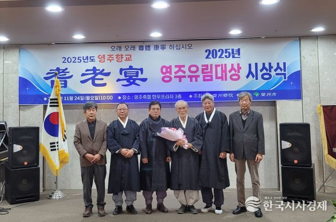 한국시사경제 경북취재본부 | 영주시는 지난 24일 영주축협한우프라자 3층 대강당에서 열린 ‘2025년 영주향교 기로연’와 함께 ‘2025년 제1회 영주 유림대상’ 시상식을 개최했다.