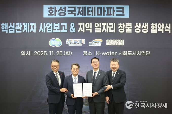 이날 김 지사는 정명근 화성시장, 임영록 신세계그룹 사장, 안정호 K-water 그린인프라부문장과 ‘화성 국제테마파크 지역 일자리 창출 및 상생협력 업무협약’을 체결했다.