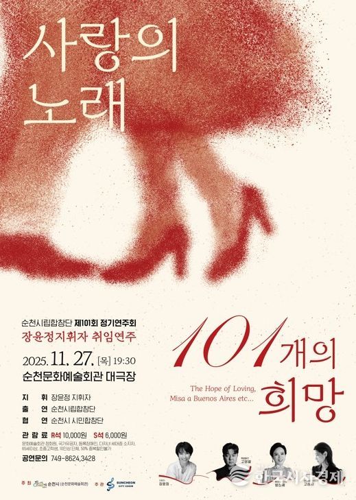 한국시사경제 전남취재본부 | 순천시는 오는 27일 저녁 7시 30분, 순천문화예술회관 대극장에서 순천시립합창단 제101회 정기연주회 '사랑의 노래, 101개의 희망'을 개최한다고 밝혔다.