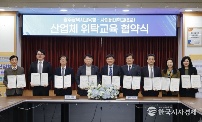 시교육청은 27일 중회의실에서 이정선 교육감, 국제사이버대학교 홍승정 총장, 서울사이버대학교 이은주 총장, 원광디지털대학교 김윤철 총장, 사이버한국외국어대학교 김병철 총장 직무대행, 한양사이버대학교 정현철 부총장, 경희사이버대학교 신봉섭 부총장, 건양사이버대학교 이진경 입학홍보처장, 고려사이버대학교 백창현 입학처장 등이 참석한 가운데 ‘산업체 위탁교육 업무협약’을 체결했다.
