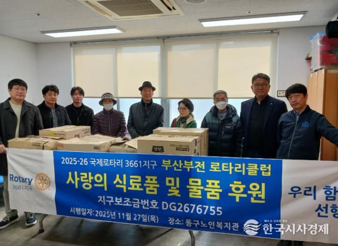한국시사경제 부산취재본부 | 부산부전로타리클럽은 11월27일 동구노인복지관 분관에 사랑의 식료품 및 물품을 후원하며 지역사회 나눔을 실천했다.