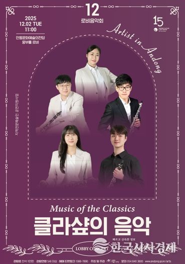 한국시사경제 경북취재본부 | 안동문화예술의전당은 지역예술인들에게 다양한 무대 경험을 제공하고, 시민에게는 일상 속 음악 향유할 수 있는 기회를 마련하고자, 매월 첫째 주 화요일 오전 11시에 로비음악회 시리즈를 진행하고 있다. 올해 마지막 로비음악회는 ‘클라샵’의 공연으로 12월 2일 오전 11시, 웅부홀 로비에서 '클라샾의 음악'이라는 제목으로 개최된다.