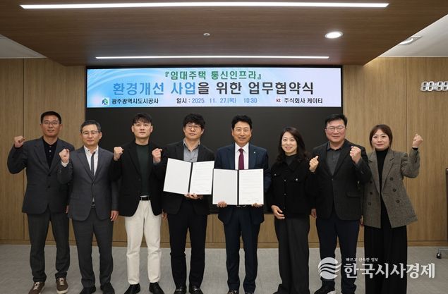 한국시사경제 광주취재본부 | 광주도시공사(사장 김승남)는 27일 빛고을고객센터에서 주식회사 케이티(광주지사장 김태오)과 함께 임대주택 통신인프라 환경개선을 위한 업무협약(MOU)을 체결했다.
