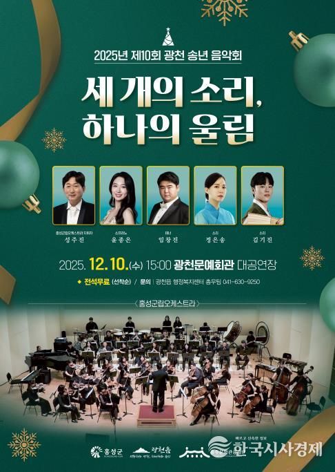 한국시사경제 오영주 기자 | 홍성군 광천읍은 2025년을 마무리하며, 지역민들에게 문화 향유의 기회를 확대하고 잊지 못할 감동을 선사하기 위해 ‘제10회 광천 송년음악회 '세 개의 소리, 하나의 울림'’을 개최한다고 밝혔다.