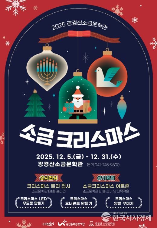 한국시사경제 김태훈 기자 | (재)논산문화관광재단이 주관하는 강경산 소금문학관이 크리스마스를 앞두고 관람객들에게 따뜻한 연말 분위기를 선사할 크리스마스 트리 전시와 특별 문화예술 프로그램을 선보인다.