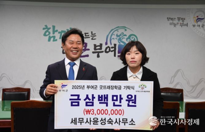 한국시사경제 김태훈 기자 | 세무사윤성숙사무소(대표 윤성숙)는 지난 3일 부여군청을 방문하여 인재 육성을 위한 장학금 3백만 원을 (재)부여군굿뜨래장학회에 기탁했다.