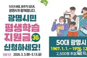 한국시사경제 경기취재본부 | 광명시가 50대 중장년 시민의 배움 기본권 보장을 위해 올해도 평생학습지원금 지원을 이어간다. 시는 오는 3월 3일부터 13일까지 11일간 ‘2026년 광명시민 평생학습지원금’ 신청을 받는다고 26일 밝혔다. 광명시민 평생학습지원금은 생애 전환기를 맞은 50대 시민이 나이·소득·배경과 관계없이 배움을 지속할 수 있도록 생애 1회 1인당 30만 원의 평생학습이용포인트를 지원하는 사업이다. 시민 스스로 자신의 삶과 필요에 맞는 학습을 선택하도록 돕는 것이 핵심 목적이다. 박승원 광명시장은 “배움은 선택이 아닌 누구에게나 보장돼야 할 기본권”이라며 “시민이 나이나 환경의 제약 없이 언제든지 배움을 이어갈 수 있도록 평생학습 기반을 더욱 탄탄히 만들어가겠다”고 밝혔다. 신청 대상은 1967년 1월 1일부터 1976년 12월 31일 사이에 출생한 50대 광명시민이다. 광명시에 1년 이상 계속 거주했거나, 거주기간을 합산해 5년 이상 거주하고 있어야 한다. 시는 총 2천500명을 선정해 지원한다. 59세(1967년생)는 올해가 마지막 지원 대상임을 고려해 우선 선정하고