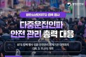 한국시사경제 문화팀 | 방탄소년단(BTS) 컴백 행사 다중운집인파 안전 관리 총력 대응 - BTS 컴백 행사 인파 안전관리 관계기관 대책회의 '26.3.11.(수) 개최 ▲ 행정안전부 - 다중운집인파 재난 위기경보 '주의' 단계 발령 일시: 3.21.(토) 00:00~24:00 / 지역: 서울 종로구·중구 - '정부합동안전점검단' 구성, 안전관리 실태 사전 점검 ▲ 문화체육관광부 - 공연 안전을 위한 자문 및 무대시설·객석 점검 ▲ 보건복지부 응급 환자 발생 대비, 재난의료지원팀(DMAT) 및 보건소 신속대응반 출동체계 사전 구축 ▲ 경찰·소방 - 행사장 주변 질서 유지 및 치안 확보, 대테러 방지 활동 - 구조·구급요원·구급차 현장 배치 ▲ 서울시 - 시민안전대책본부 가동, 안전관리계획 이행 여부 확인 - 안전 안내 문자 발송 및 질서 있는 관람 유도