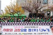 한국시사경제 울산취재본부 | 남구새마을회(회장 황병철)는 남구청 후생관 앞 주차장에서 따뜻한 손길이 더욱 필요한 동절기를 맞아 ‘사랑의 김장으로 김장담그기 행사’를 실시했다고 27일 밝혔다. 이번 행사는 26일과 27일 2일간 일정으로 소외되는 이웃이 없는 밝고 인정 넘치는 행복남구 건설을 위해 마련됐고, 남구새마을회(회장 황병철), 남구새마을협의회(회장 서병찬), 남구새마을부녀회(회장 최인순)와 회원 등 150여 명이 참여한 가운데 김장 김치를 담갔다. 서동욱 남구청장도 새마을 지도자와 함께 이웃들에게 따뜻한 정을 나누기 위한 손길을 보탰다. 이날 정성껏 담근 김장김치는 관내 독거노인, 취약계층, 다문화가정, 기초생활수급자 등 400여 세대에 복지시설에 전달할 예정이다. 황병철 남구새마을회장은 “사랑이 담긴 김장 나눔이 이웃들에게 겨울을 따뜻하게 견뎌낼 수 있는 큰 힘이 됐으면 한다” 고 말했다.