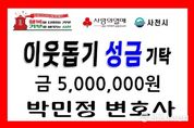한국시사경제 윤광희 기자 | 박민정 사천시 고문변호사는 지난 15일 사천시청을 방문해 관내 공동생활가정 까치둥지(200만 원), 모모네(150만 원), 호산나 그룹홈(150만 원)에 성금 500만 원을 기탁했다. 박민정 변호사는 법률 전문가로서 아동의 권익 보호에 적극적으로 힘써왔으며, 2022년부터는 관내 어려운 이웃들을 위해 성금과 물품을 꾸준히 기탁하는 등 지역사회에 대한 사랑을 실천하고 있다. 박민정 변호사는 “이번 기탁이 관내 공동생활가정의 아동들에게 도움이 됐으면 좋겠다.”고 말했다. 기탁한 성금은 경남사회복지공동모금회를 통해 공동생활가정에 지정 기탁되어 사용될 예정이다.